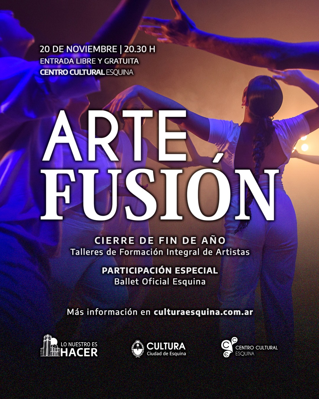 El próximo jueves 20 de noviembre de 2025, a las 20.30 h, la Sala Sociedad Italiana del CENTRO CULTURAL ESQUINA se vestirá de gala para recibir ARTEFUSIÓN, el espectáculo de cierre de los Talleres de Formación Integral de Artistas. La velada contará con la participación especial del Ballet Oficial Esquina y una entrada libre y gratuita, invitando a toda la comunidad a celebrar un año de trabajo, aprendizaje y crecimiento artístico.