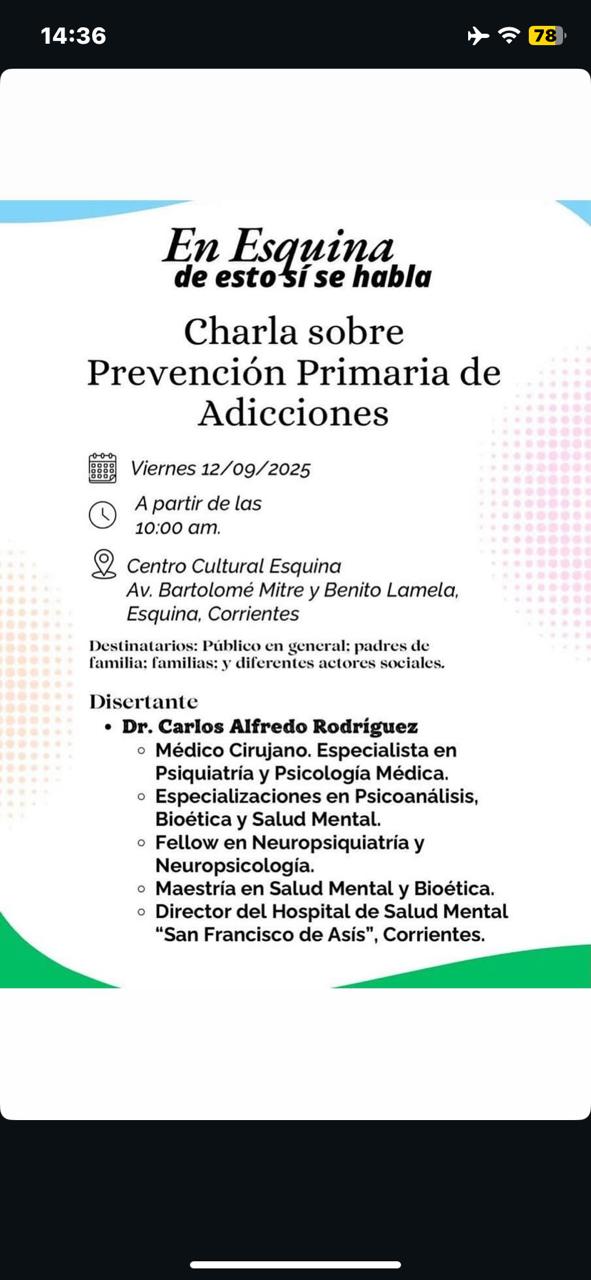 El viernes 12 de septiembre de 2025, a partir de las 10 de la mañana, se llevará a cabo en el CENTRO CULTURAL ESQUINA una importante Charla sobre Prevención Primaria de Adicciones, destinada a toda la comunidad. La actividad está orientada al público en general, en especial a padres de familia, jóvenes y distintos actores sociales interesados en la temática.