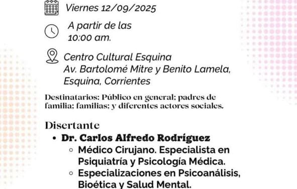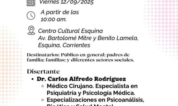 El encuentro contará con la disertación del Dr. Carlos Alfredo Rodríguez, reconocido médico cirujano y especialista en Psiquiatría y Psicología Médica, con una amplia trayectoria en el campo de la salud mental. Rodríguez posee, además, especializaciones en Psicoanálisis, Bioética y Salud Mental, es fellow en Neuropsiquiatría y Neuropsicología, y cuenta con una maestría en Salud Mental y Bioética. Actualmente se desempeña como director del Hospital de Salud Mental “San Francisco de Asís” en Corrientes.
