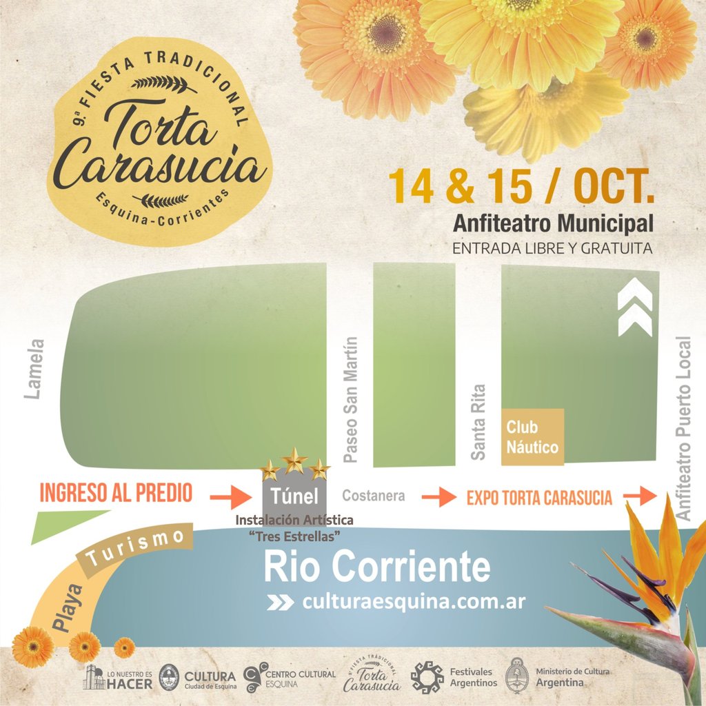 La Dirección de Cultura de la ciudad de Esquina se complace en invitar a músicos, músicas, bandas, conjuntos y solistas de todos los géneros a formar parte de la emocionante grilla artística que dará vida a los dos días de la Novena Fiesta Tradicional de la Torta Carasucia.