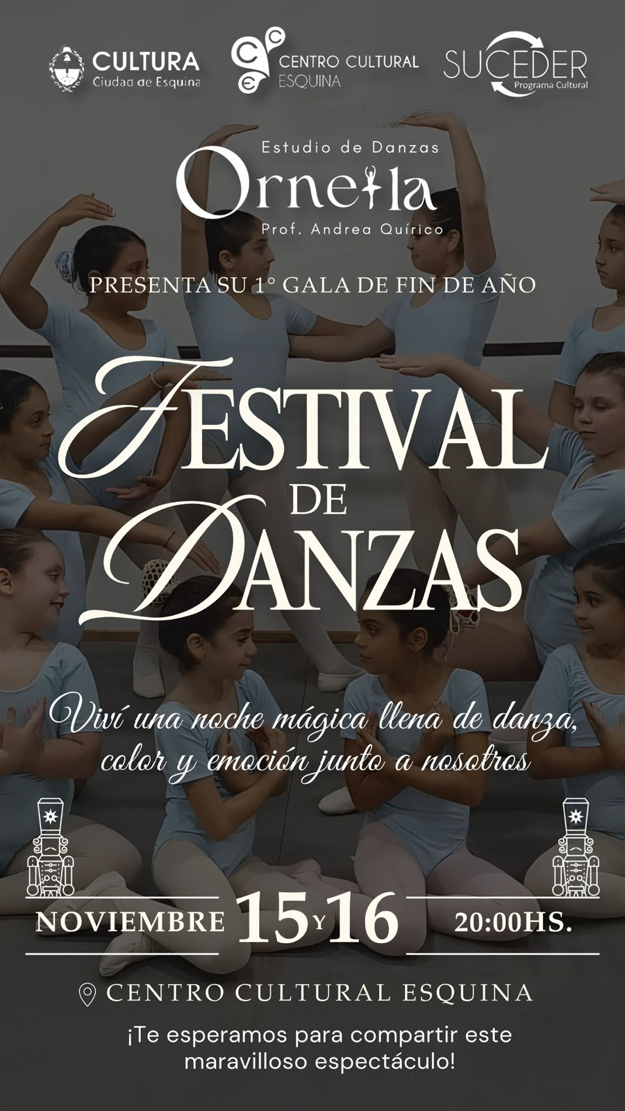 La danza clásica será protagonista de una noche inolvidable en el CENTRO CULTURAL ESQUINA, con la realización del Primer Festival de Danzas del Estudio “Ornella” – Gala de Fin de Año, un evento que reunirá sobre el escenario todo el trabajo, la pasión y el talento cultivado durante el año bajo la dirección de Andrea Carla Quirico.